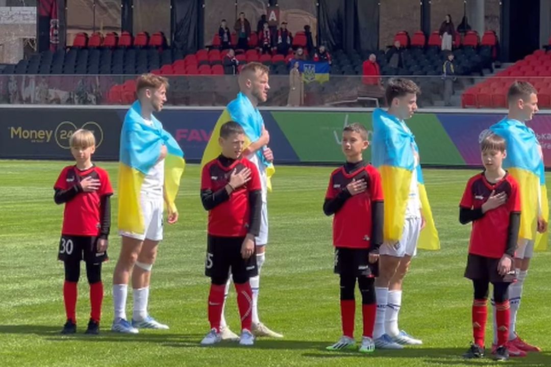Înaintea încercării de începere a partidei la 13:15, a existat un moment de reculegere în memoria victimelor atacului recent al rușilor în Krivoi Rog, soldat cu cel puțin 20 de morți, printre care 9 copii. De altfel, lovitura de start a dat-o, simbolic, un bărbat al cărei familii și-a pierdut viața în atacul țării vecine. El a pășit spre centrul terenului în aplauzele fotbaliștilor.