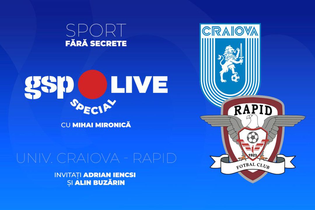 Aceștia vor prefața meciul dintre Universitatea Craiova și Rapid și vor primi informații în timp real de la reporterii GSP.ro aflați la Stadionul „Ion Oblemenco” din Bănie. Apoi vor reveni în direct la pauză și la final pentru concluziile serii.