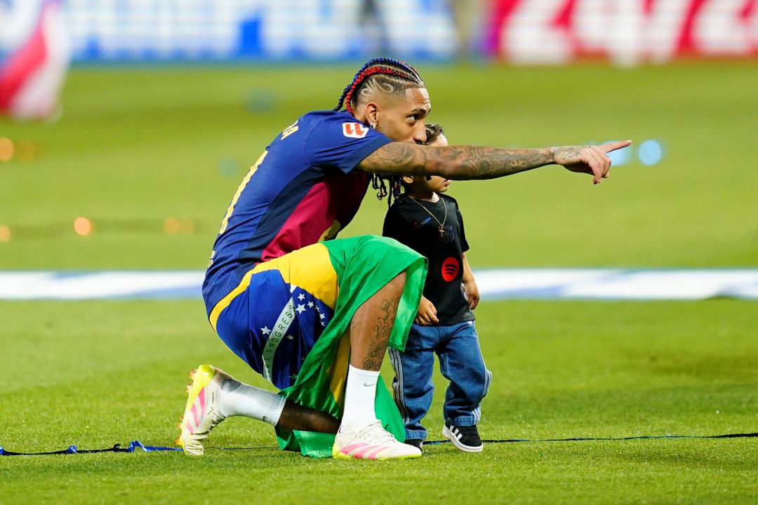 Raphinha și-a luat băiețelul pe gazonul de pe Montjuic și a traversat terenul pe lungimea lui în genunchi. Apoi, la capătul drumului, s-a închinat la sol în fața liniei porții, mulțumind Divinității pentru titlul tocmai câștigat cu Barcelona și repetând astfel modul în care celebrase salvarea de la retrogradarea cu Leeds.