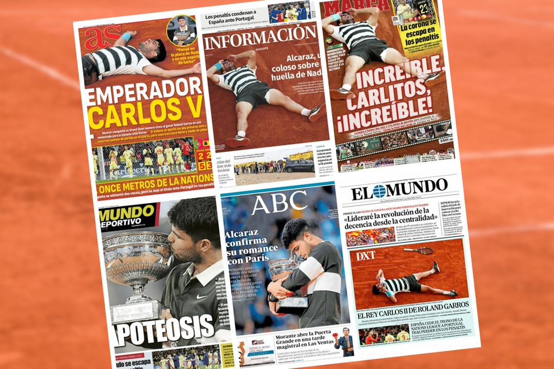 Numărul 2 mondial, Carlos Alcaraz (22 de ani) și-a păstrat titlul pe zgura de la Roland Garros, după o finală epică, de 5 ore și jumătate, în fața liderului ATP, Jannik Sinner (23 de ani), 4-6, 6-7 (4), 6-4, 7-6 (3), 7-6 (10-2). Performanța sa a fost prezentă pe toate primele pagini ale ziarelor din Spania.
