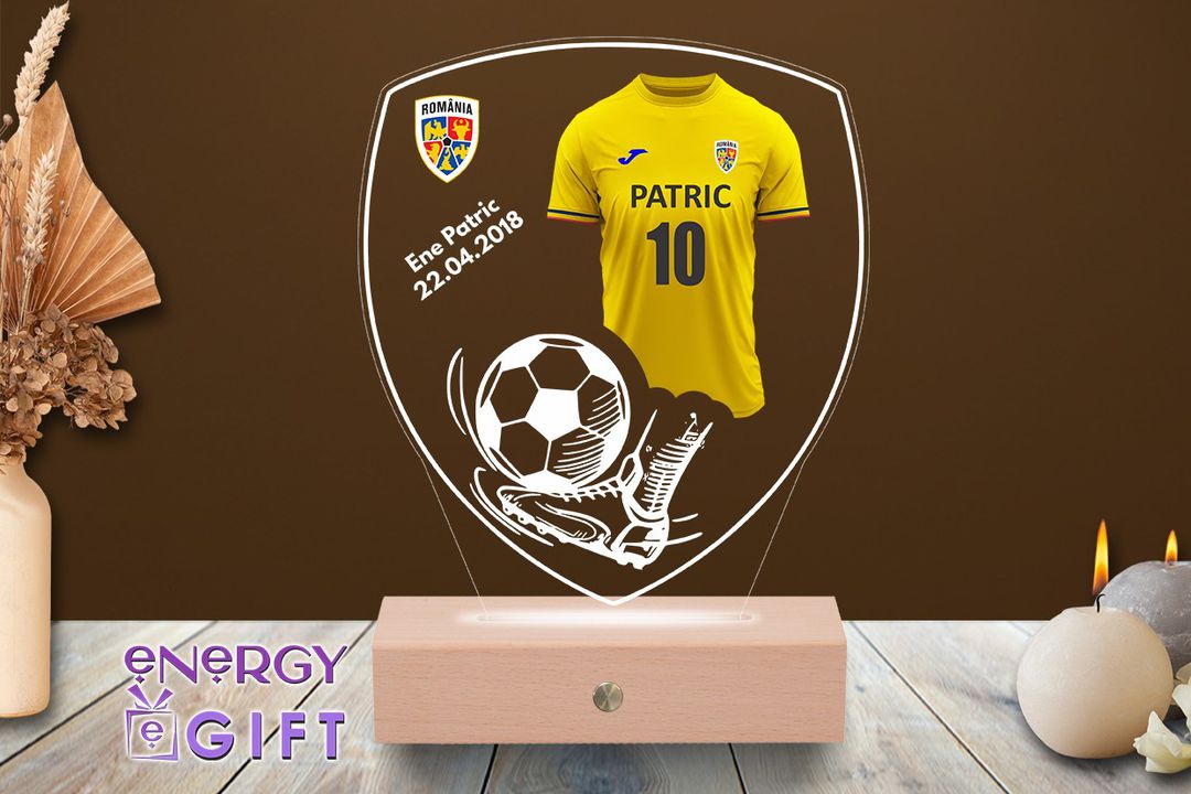 Lampa LED 3D personalizată de la EnergyGift.ro este realizată din acril premium, printat UV cu tehnologie de ultimă generație 1200DPI. Pe suprafața transparentă este reprezentat tricoul unei echipe de fotbal, alături de detalii precum minge și ghete, toate iluminate spectaculos datorită bazei LED inovatoare. Personalizarea se face cu numele și numărul dorit – astfel, orice suporter poate avea propria „replică” a tricoului preferat, cu numele său sau al idolului de pe teren.