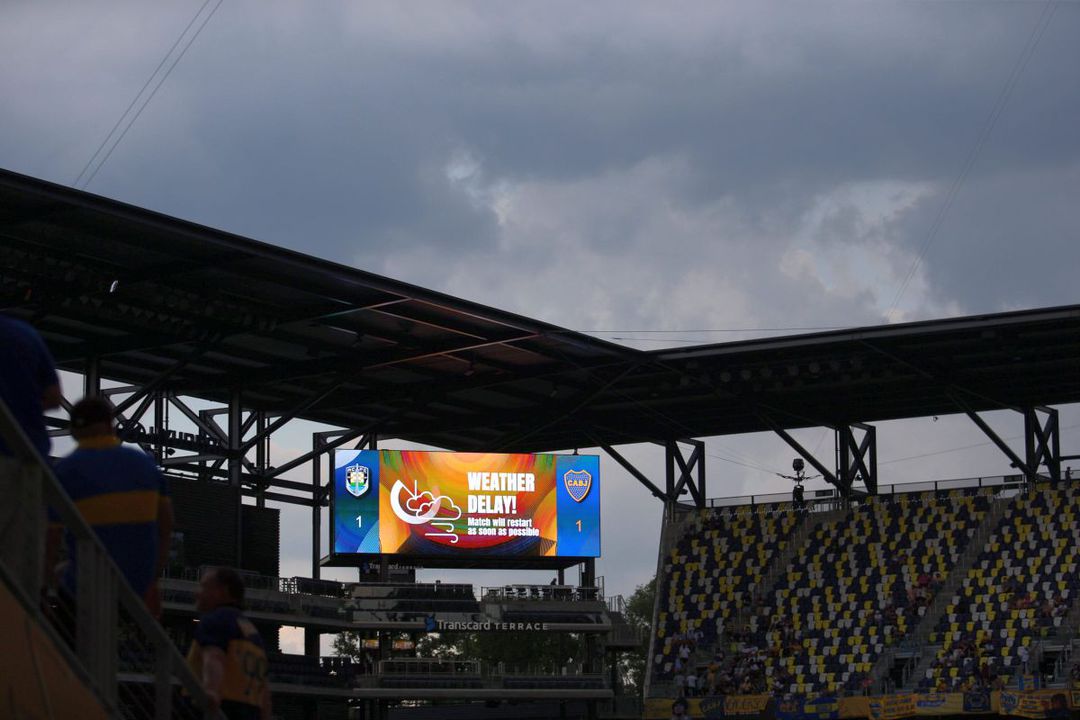 Meciul poate fi reluat la aproximativ 30 de minute de la ultimul fulger sau tunet înregistrat pe o rază de 16 kilometri. În cel mai rău caz, evenimentul poate fi anulat complet, lucru care, din fericire, nu s-a întâmplat încă la Campionatul Mondial al Cluburilor.
