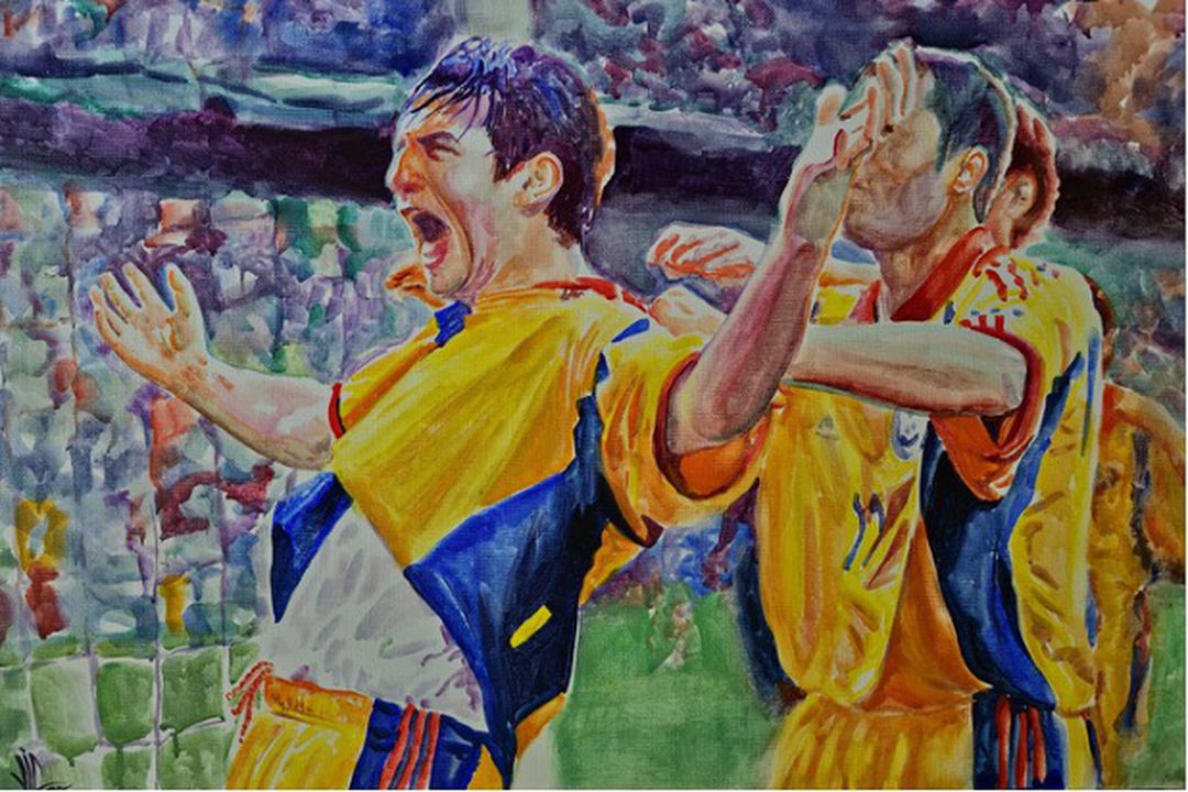 Fotbalul este Artă” de la Centrul Cultural “Mihai Eminescu”Desi au fost reprezentate pe panza momente importante din istoria nationalei, precum duelul dintre Pele si Rica Raducanu, golul lui Dan Petrescu in poarta lui Seaman de la Europeanul din 1998 sau celebrarea lui Raducioiu de la Mondialul din ’94, cea mai apreciata si fotografiata pictura a fost cea a lui Mircea Lucescu, actualul antrenor al echipei nationale.