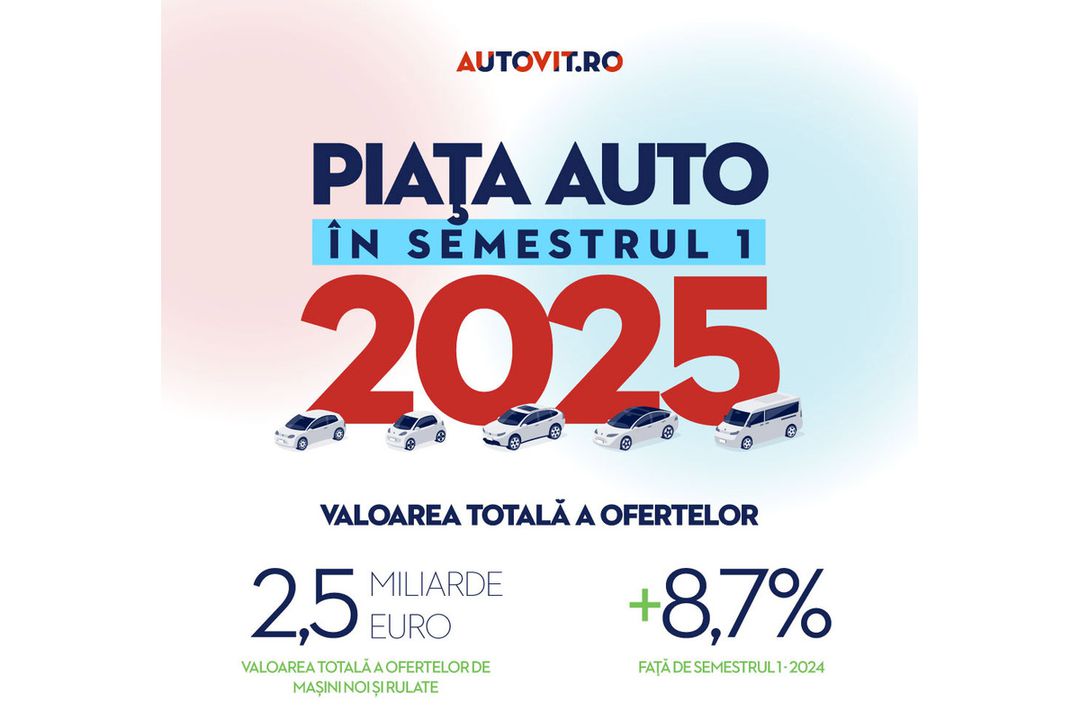 Conform datelor analizate de Autovit.ro, cea mai mare platformă auto online din România, valoarea totală a ofertelor de mașini noi și rulate listate în intervalul ianuarie - iunie 2025 a depășit pragul de 2,5 miliarde de euro, față de 2,3 miliarde de euro în aceeași perioadă a anului 2024, marcând o creștere de 8,7%.