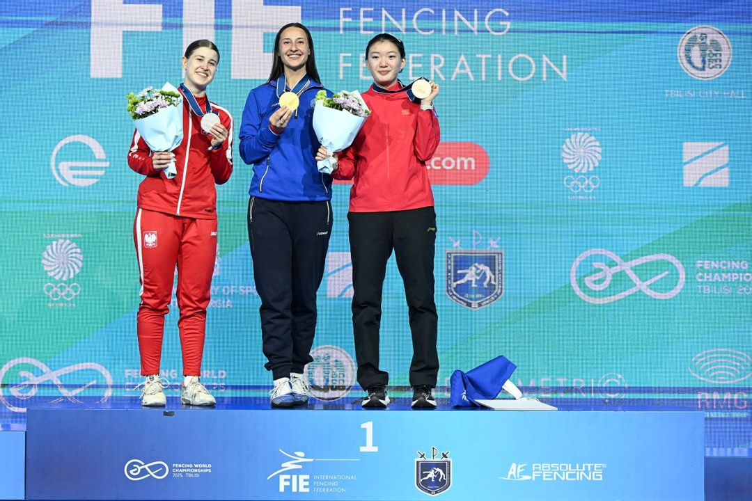 Momentul premierii, în care apare și ucraineanca Alina KomashchukÎn semn de protest față de patriciparea rușilor la Campionatele Mondiale de scrimă 2025, sabrera ucraineană a preferat să nu împartă gloria cu Egorian, lăsând podiumul de la Tbilisi incomplet la momentul pozelor oficiale.