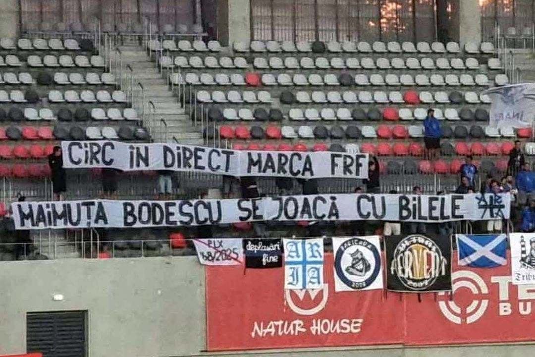 Scandalul declanșat de problemele legate de tragerea la sorți a meciurilor continuă. Fanii de la Farul Constanța au afișat luni, la partida din campionat cu FC Hermannstadt, un mesaj jignitor împotriva Federației Române de Fotbal: „Circ în direct marca FRF / Maimuța Bodescu se joacă cu bilele”.