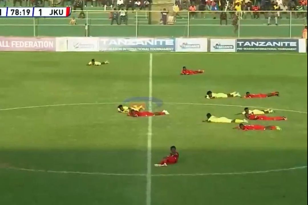 Meciul dintre City FC Abuja și JKU FC, din Tanzania, a oferit momente rar văzute pe terenul de fotbal. Toți jucătorii aflați pe gazon s-au aruncat la pământ și au stat nemișcați secunde bune, în minutul 78.