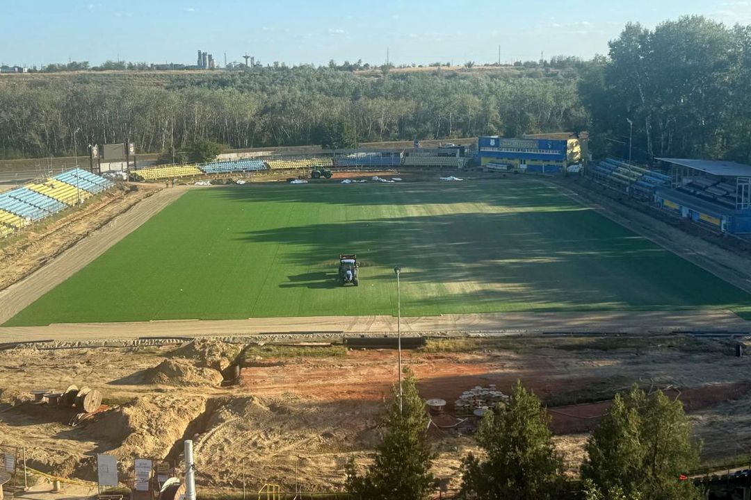 Gazonul sintetic este deja montat, se adaugă straturile de nisip care fixează suprafața, iar de joi urmează să înceapă însămânțarea cu gazon natural.