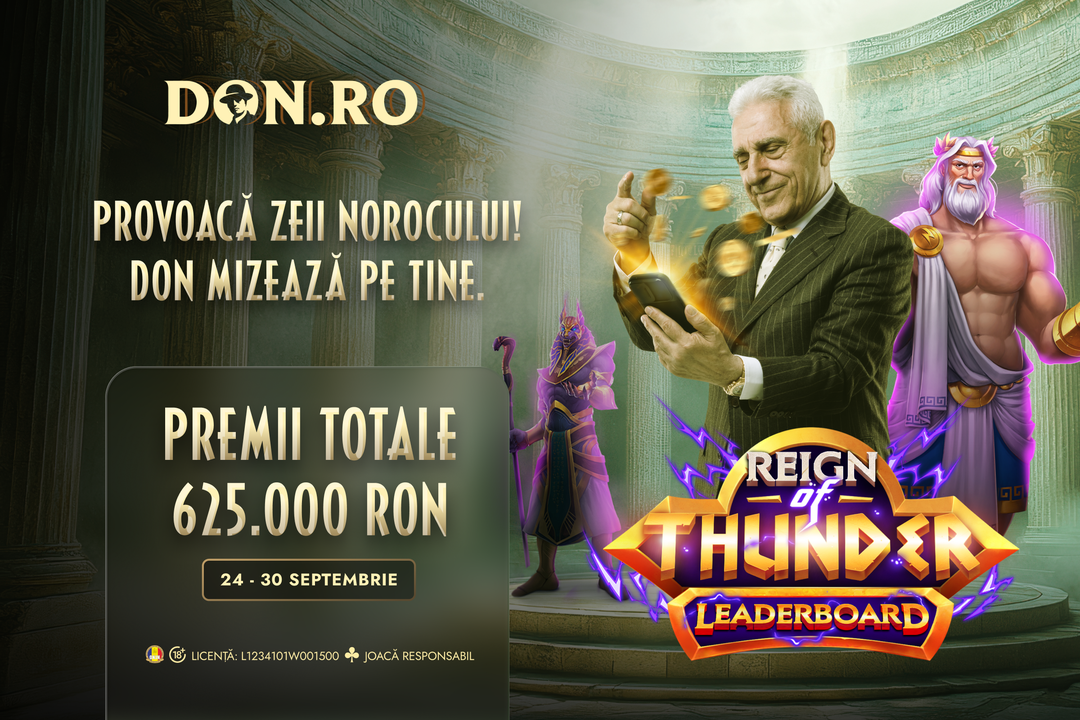 Când Don intră în Olimp, până și Zeus își lasă fulgerul pe masă. Pune-te cu zeii dacă vrei marele premiu din Reign of Thunder Leaderboard, în valoare de 50.000 RON. Fondul total de premii pentru promoția de rețea, în valoare de 625.000 RON, este pus în joc între 24 – 30 septembrie 2025.