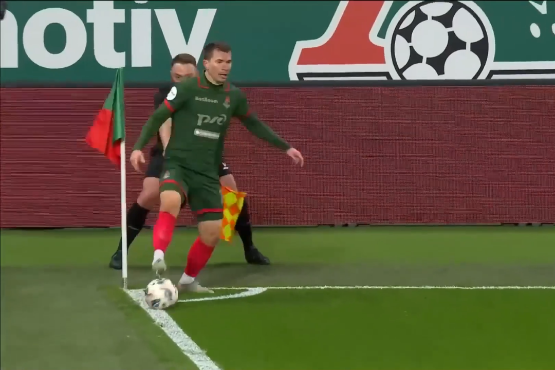 Portarul Vladislav Torop a respins mingea în Vorobyov, din care a ricoșat în lateral și părea că iese în afara gazonului, așa cum de altfel așteptau toți cei care urmăreau faza. Atacantul lui Lokomotiv a fugit și a reușit să păstreze balonul în teren, având noroc că s-a lovit de fanionul de la colț.