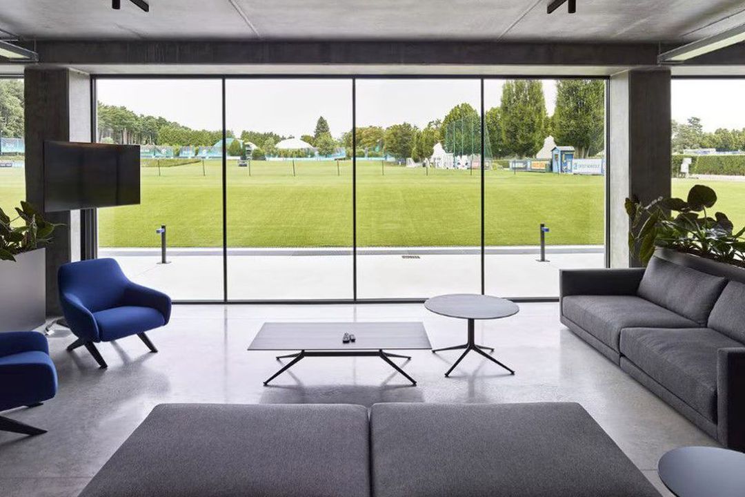 Am putut vedea cu ochii noștri o bază de pregătire în stil englezesc, cu iarbă peste tot, naturală combinată cu gazon artificial. Șase terenuri, pe cel principal auzindu-l pe Chivu la lucru cu elevii săi într-o atmosferă foarte destinsă, într-un centru aflat într-un proiect important de extindere, ale cărui lucrări se vor concentra în vară.