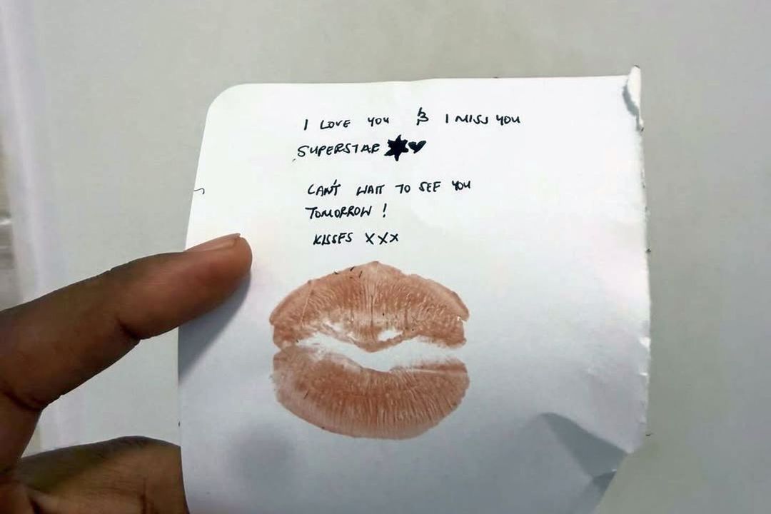 „Te iubesc și îmi e dor de tine, superstarule! Abia aștept să ne revedem mâine. Pupici", scria în bilețelul primit de Ngezana de la soția lui.