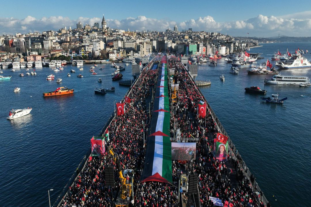 Peste 500.000 de oameni s-au adunat pe Podul Galata din Istanbul, pentru un marș masiv în sprijinul Palestinei, organizat sub umbrela Alianței Umanității și a Platformei Naționale pentru Voință.
