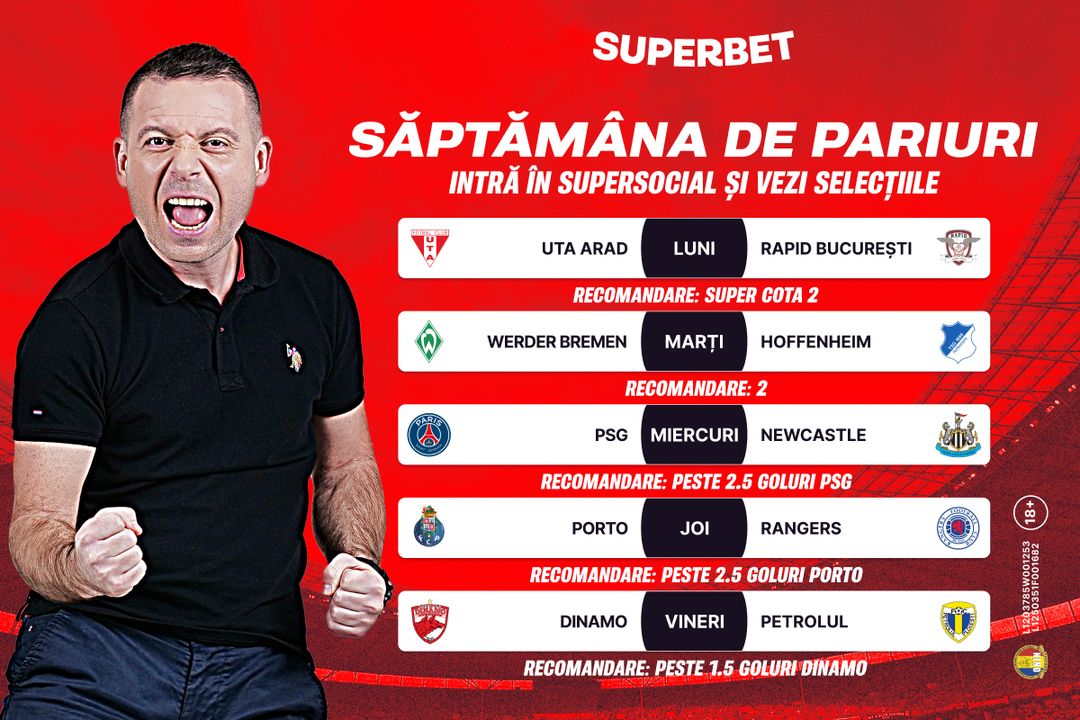 Luni, Superliga dă tonul! În UTA Arad – Rapid București, expertul SuperSocial merge pe inspirația giuleștenilor și alege Super Cota 2 (cotă 2.62 la Superbet) pentru această partidă. Mai sunt doar câteva etape din sezonul regular, drept pentru care echipele trag tare pentru un loc în play-off. Înaintea acestui meci, Rapid e pe locul 3, la 4 puncte de Craiova și 2 puncte de Dinamo.