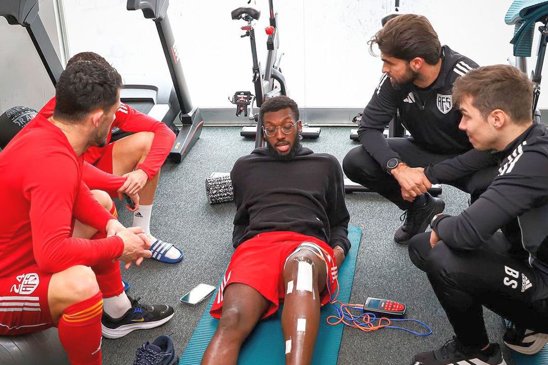 Clubul AFS a publicat marți imagini cu atacantul francez alături de colegii săi. Baroan avea piciorul stâng imobilizat în sala de forță, însă atitudinea lui era pozitivă.