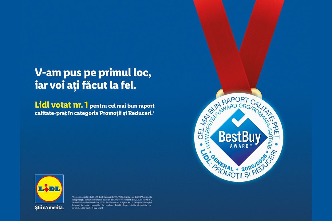 *Conform cercetării ICERTIAS Best Buy Award 2025/2026, realizate de ICERTIAS, având la bază percepția consumatorilor și un eșantion de 1.200 de respondenți din 2025, cu vârsta 18+, din mediul urban și rural, din rândul lanțurilor comerciale, Lidl a fost desemnat Câștigător No. 1 la categoria Promoții și Reduceri la toate categoriile de produse. Studiul este disponibil pe: www.icertias.com/cert/ROMANIA-541XE97.
