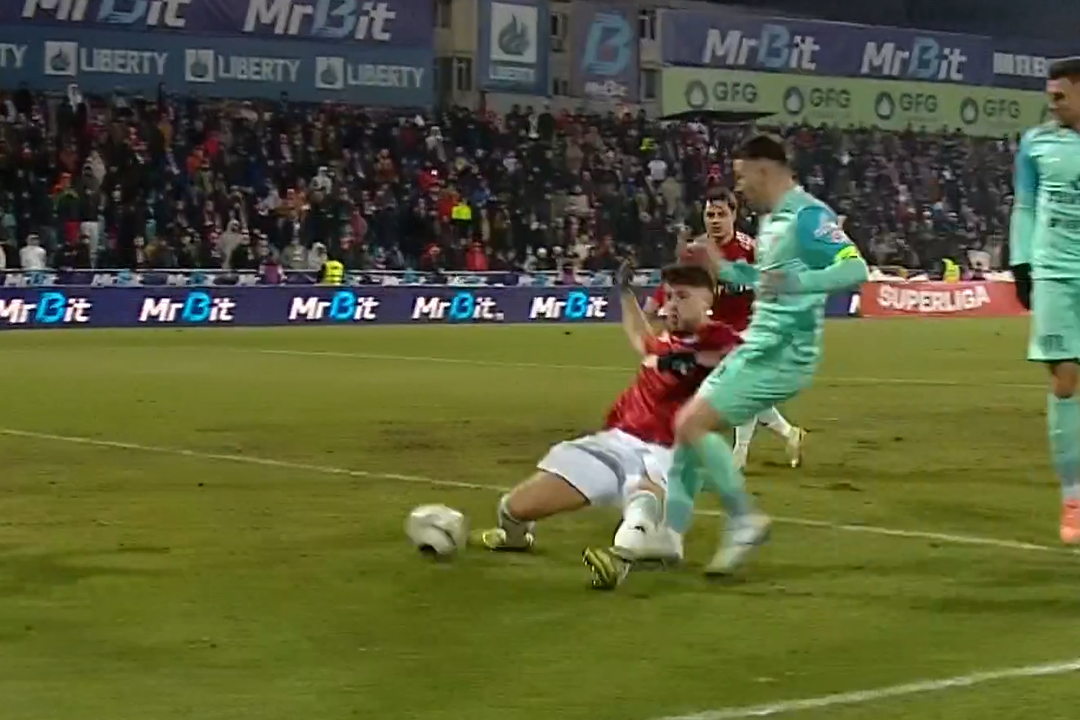Făcând abstracție de acest aspect, pare că îl calcă ușor, mai degrabă îl șterge cu piciorul. Atacul este făcut de fundaș. Atacantul pune piciorul jos acolo unde, în mod normal, trebuia să-l pună. Nu este o călcare clară a adversarului încât să poți spune că el comite faultul. Este mai mult o ștergere cu gheata. Atacul direct asupra adversarului îl face fundașul, întârziat. Atacantul lovește mingea, iar fundașul îi ia picioarele cu totul. Din punctul meu de vedere, este lovitură de la 11 metri dacă nu este ofsaid.
