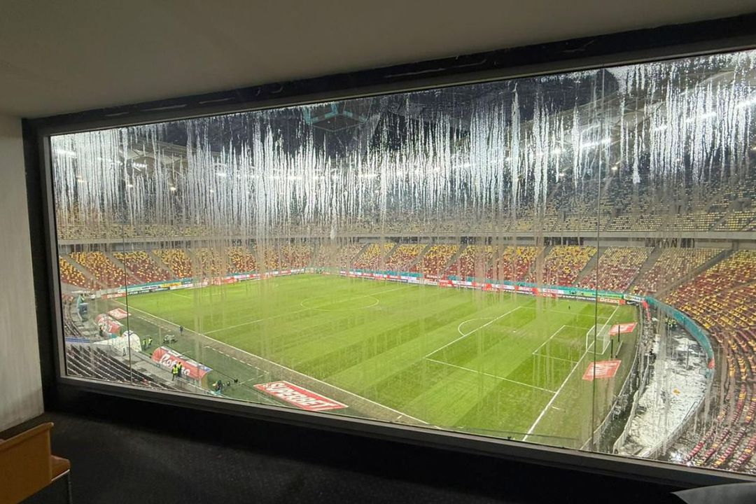Apa curge la acel nivel, formându-se o mică „cascadă” în respectiva zonă. De altfel, în tot perimetrul VIP situația se prezintă catastrofal, imaginile nefiind demne nici măcar pentru un meci de nivel județean, cu atât mai mult pentru o partidă care se dispută pe stadionul numărul 1 al României.