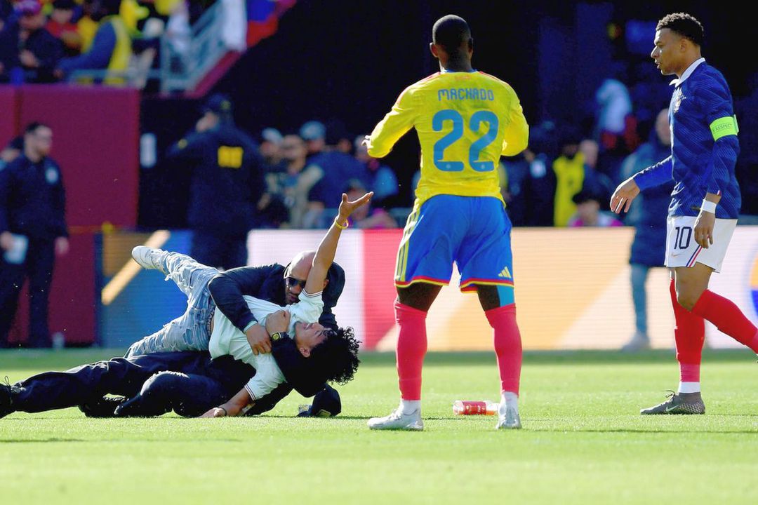 Un suporter care a invadat terenul după meciul dintre Franța și Columbia, scor 3-1, disputat duminică, la Landover, a fost imobilizat de forțele de securitate chiar în fața lui Kylian Mbappe.