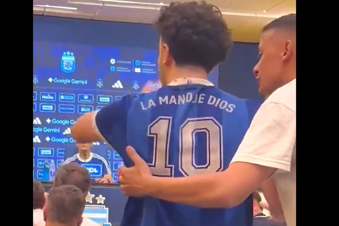 Îmbrăcat cu un tricou al naționalei Argentinei cu numărul 10 și textul „La mano de Dios” (n.r. - Mâna lui Dumnezeu, golul lui Diego Maradona de la CM 1986 cu Anglia)”, a spus câteva cuvinte și a fost dat afară imediat din conferința de presă.