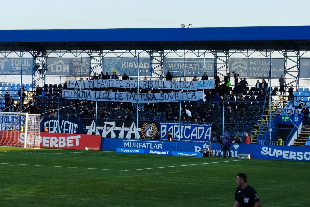 „L-ați depășit pe securistul Mitică / Cu noua lege de factură sovietică”, a fost mesajul suporterilor, cu trimitere directă la fostul președinte al LPF, Dumitru Dragomir.