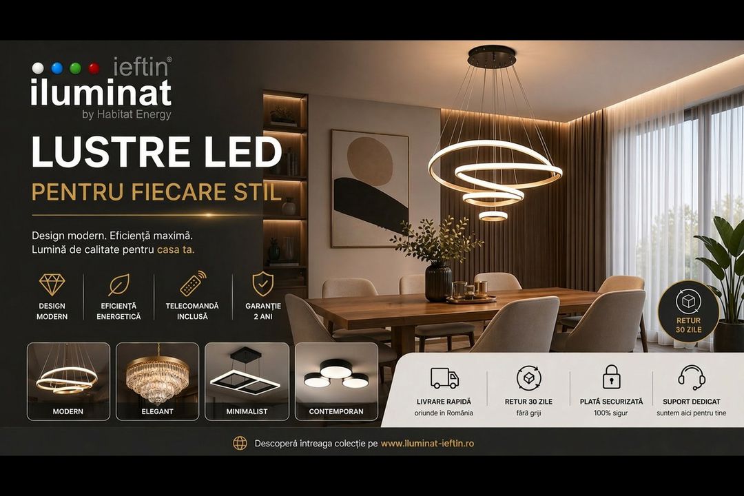 Vizitează acum secțiunea Lustre LED de pe iluminat-ieftin.ro și transformă-ți spațiul cu lumină inteligentă, elegantă și economică. O alegere bună astăzi înseamnă facturi mici și un interior spectaculos mâine!